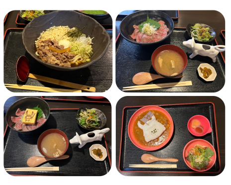 それぞれ近江牛ひこにゃん丼御膳・近江牛ローストビーフ丼御膳・ひこにゃんちびっこカレー・冷やしうどんを注文しました。